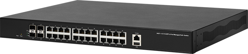 (IP-Surveillance). Коммутатор имеет 4 SFP слота (100/1000M), два из которых совмещены с портами RJ45 (Combo) и 24 медных (RJ-45) порта Ethernet 10/100/1000Base-T с поддержкой PoE.